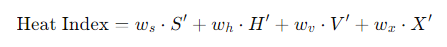 각 지표는 정규화된 후 미리 설정한 가중치에 따라 평균을 계산하여 최종 열도 값을 얻습니다. 계산식은 다음과 같습니다: